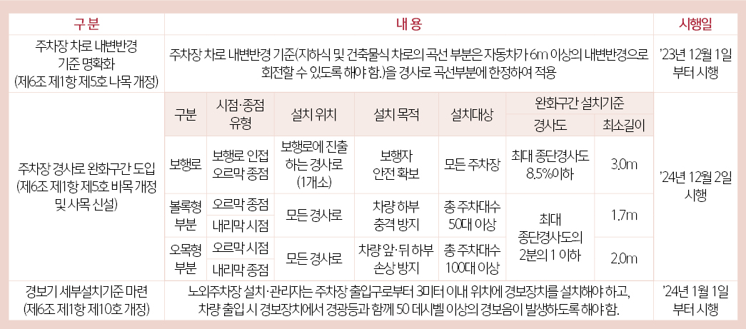 이번에 개정된 법령은 이러한 현실적인 문제를 반영하여, 더욱 안전한 주차 환경을 조성하기 위한 가이드라인이라 볼 수 있습니다. 따라서 주차장 설계자, 감리자, 시공자 모두가 이 기준을 철저히 이해하고 적용하는 것이 중요합니다.